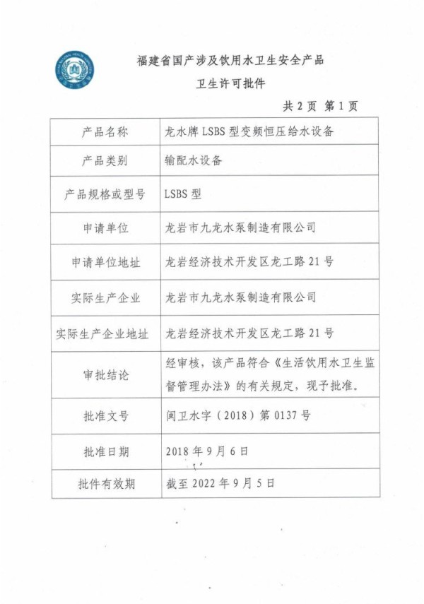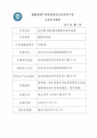 變頻恒壓供水設(shè)備衛(wèi)生許可批件