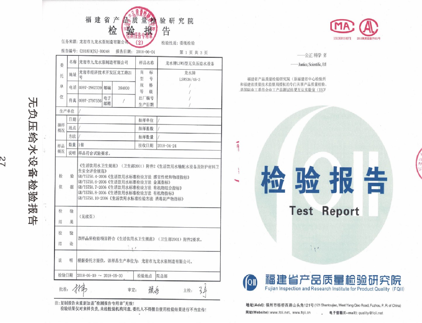 無負(fù)壓給水設(shè)備檢驗(yàn)報(bào)告